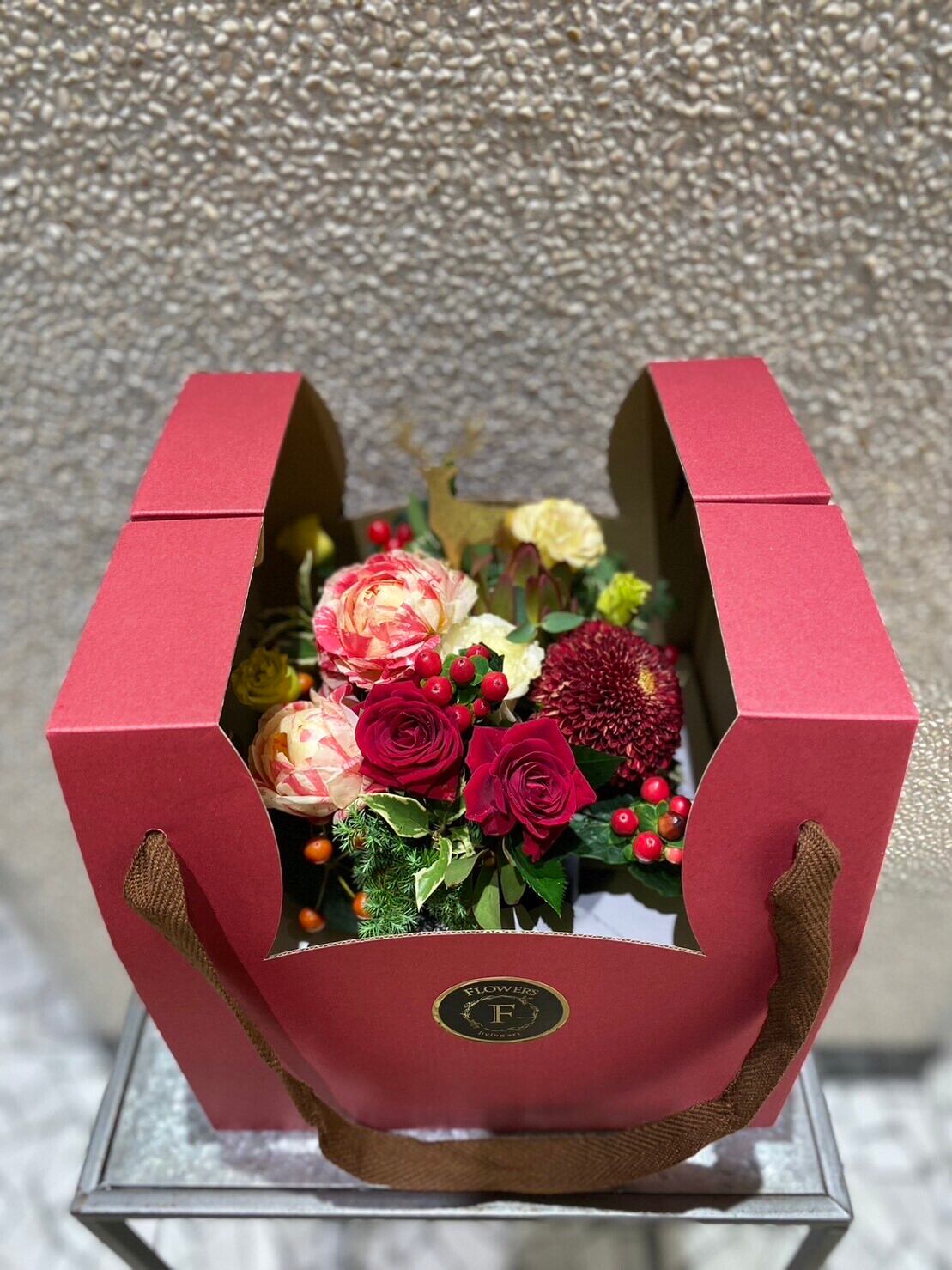 手提げBOX(Red)の生花アレンジメントは、花の美しさと手軽さを両立させた一品です。お部屋に飾ったり、贈り物として使いたい方に特にお勧めです。大切な方への感謝の気持ちを花で伝えたい方や、おしゃれなインテリアアイテムをお探しの方にぴったりです。